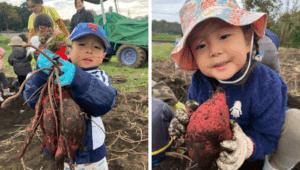 水曜日は、お芋掘り🍠! 戸塚にある農園にバスで行ってきました!農園に到着してキッズサイズの軍手をつけて、みんなで一斉にお芋掘りスタート✨掘っていくとだんだん紫の頭が見えてきました👀みんな頑張ってどんどん掘っていきますが、お芋が大きくってなかなか掘り終わりません🤣それでもふか〜く掘って大きなお芋をゲット!ほっんとうに大きくて運ぶのも大変でしたがたくさんお芋がとれて大喜びの子どもたちでした! そして、お芋掘りを頑張った後のランチも大喜び✨だっておうちの人が作ってくれたお弁当が食べられるんだもん🍙ランチを食べた広場は高台にありましたが、一生懸命登った先にはなんと!!富士山と大山が並んで綺麗に見えました!そんな最高の景色を眺めながらランチタイム〜1日満喫して帰ってきました🚌