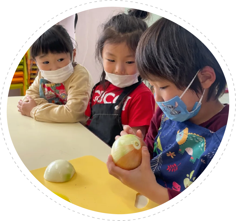ランチの時間は、クラス関係なくみんなで、先生も一緒にいただきます。その日にあったことや、旬のお野菜や味についてワイワイ話しながら、食への興味や食を通した言葉の豊かさを育てていきます。
